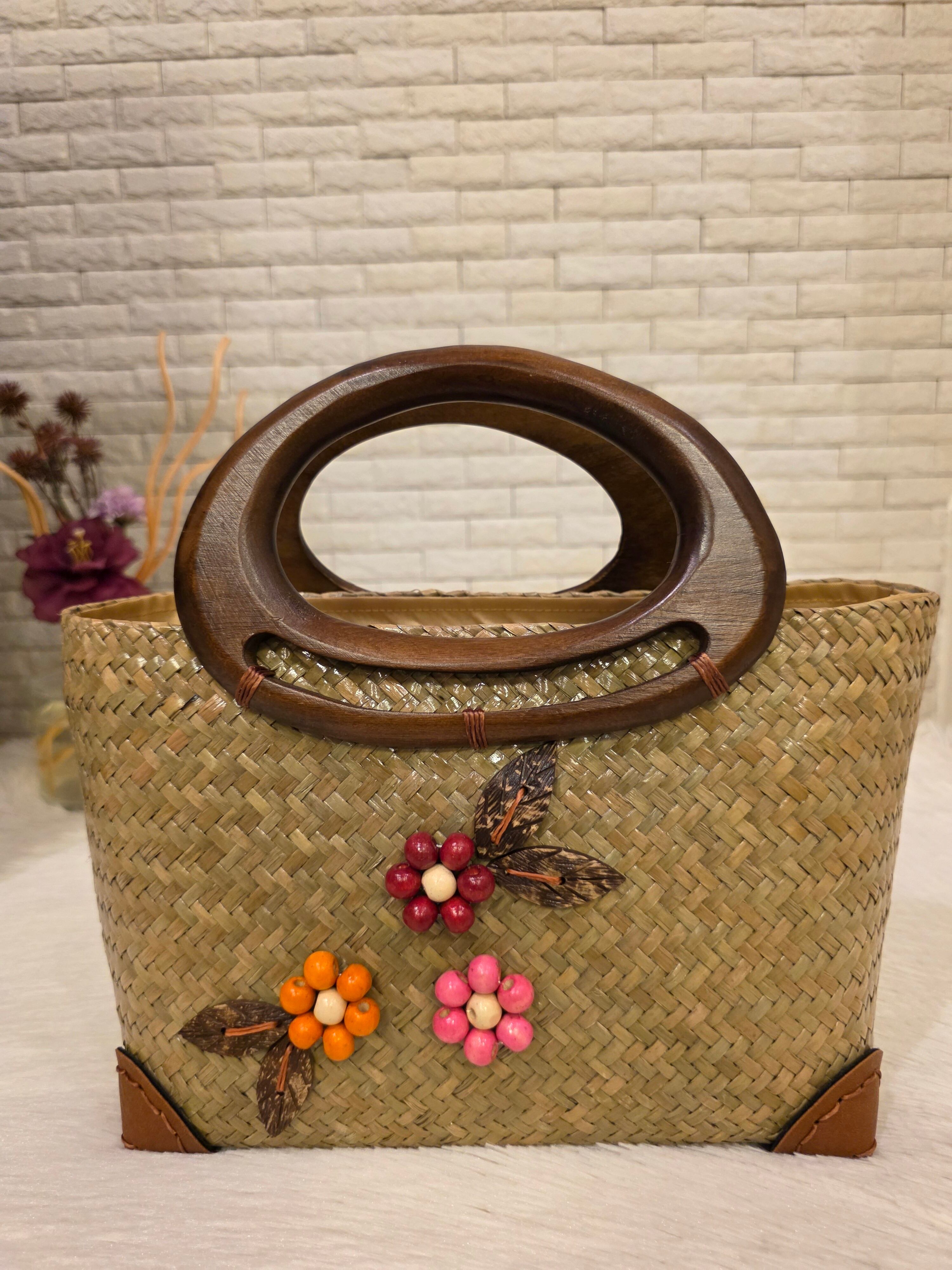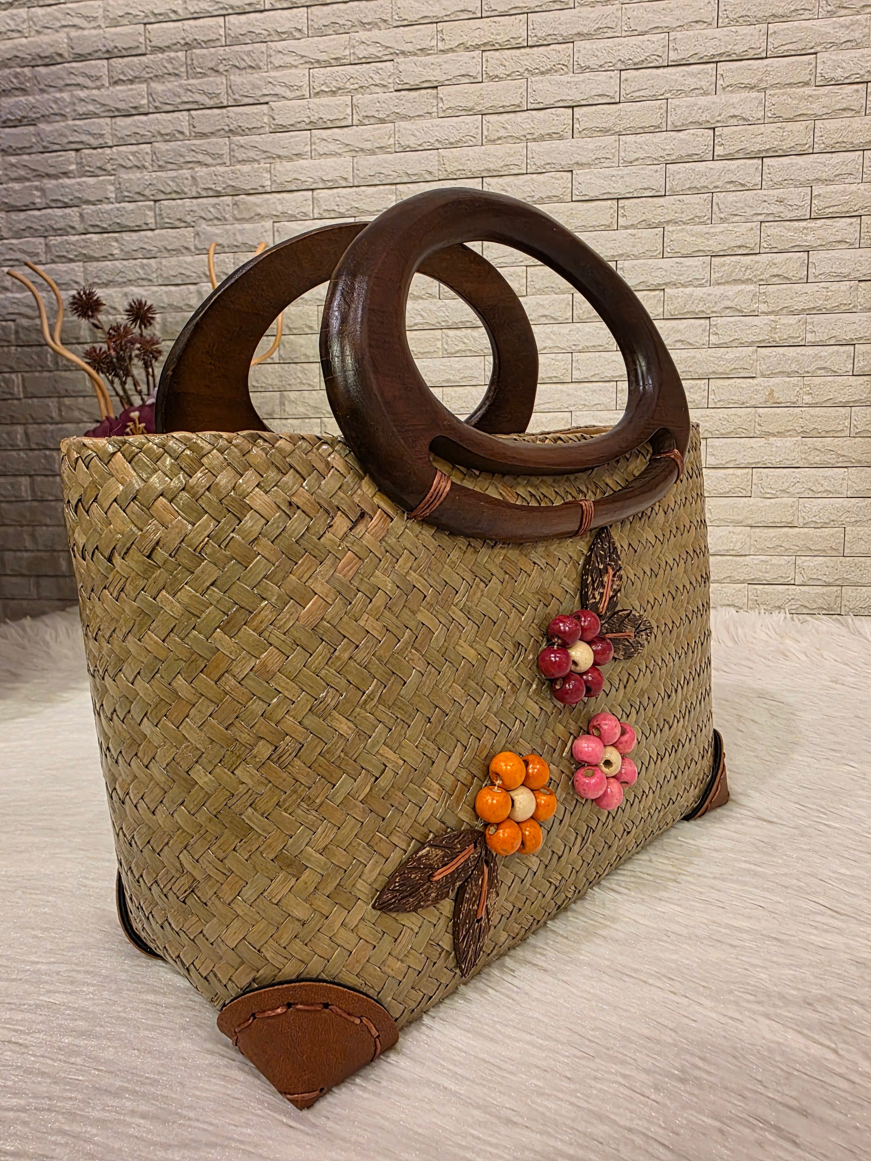 本体は、職人の手によって丁寧に編み上げられた天然素材。その上部に配された色とりどりの柄が、バッグ全体に華やかさをプラスしています。