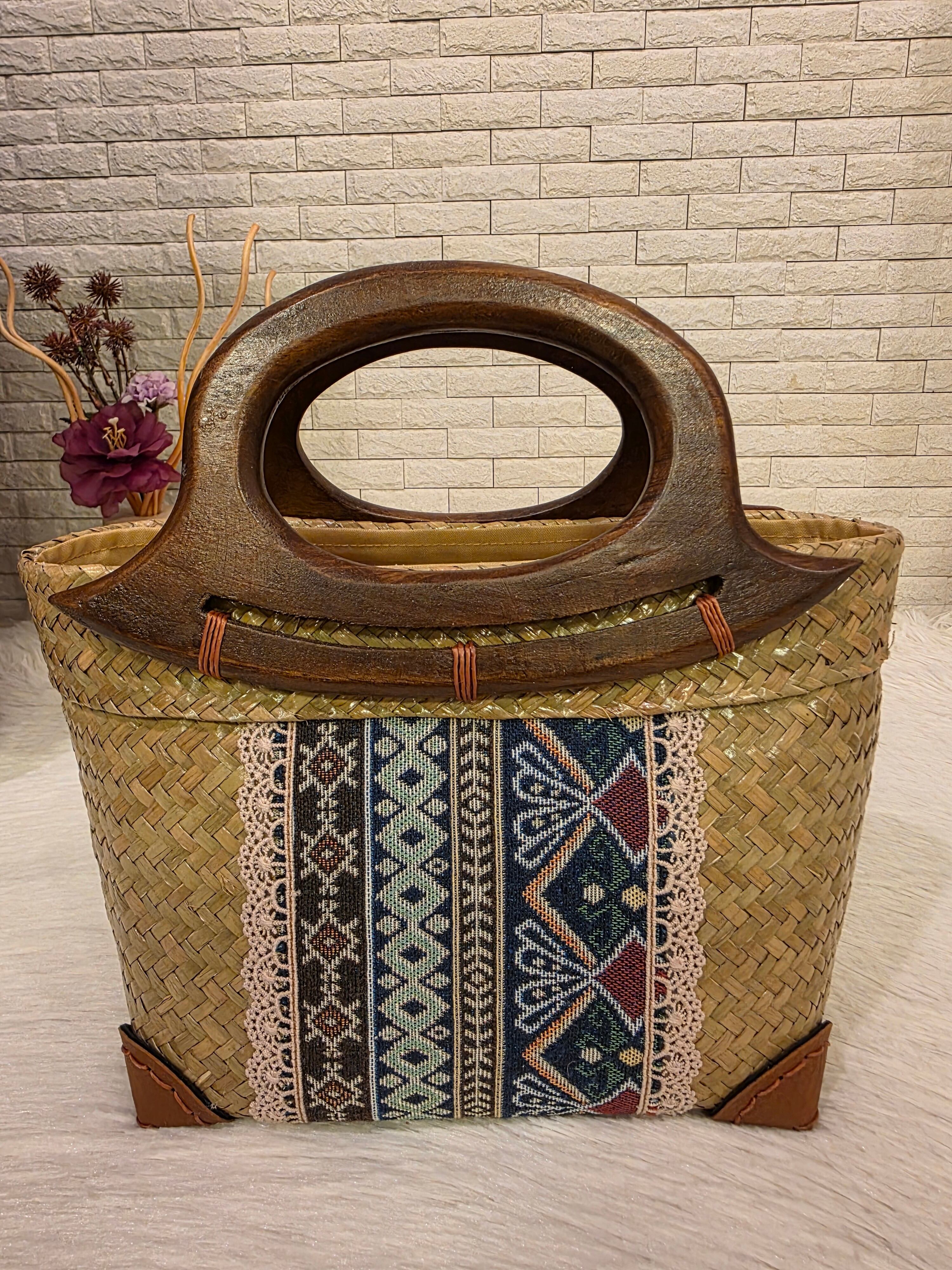 本体は、職人の手によって丁寧に編み上げられた天然素材。その上部に配された色とりどりの柄が、バッグ全体に華やかさをプラスしています。