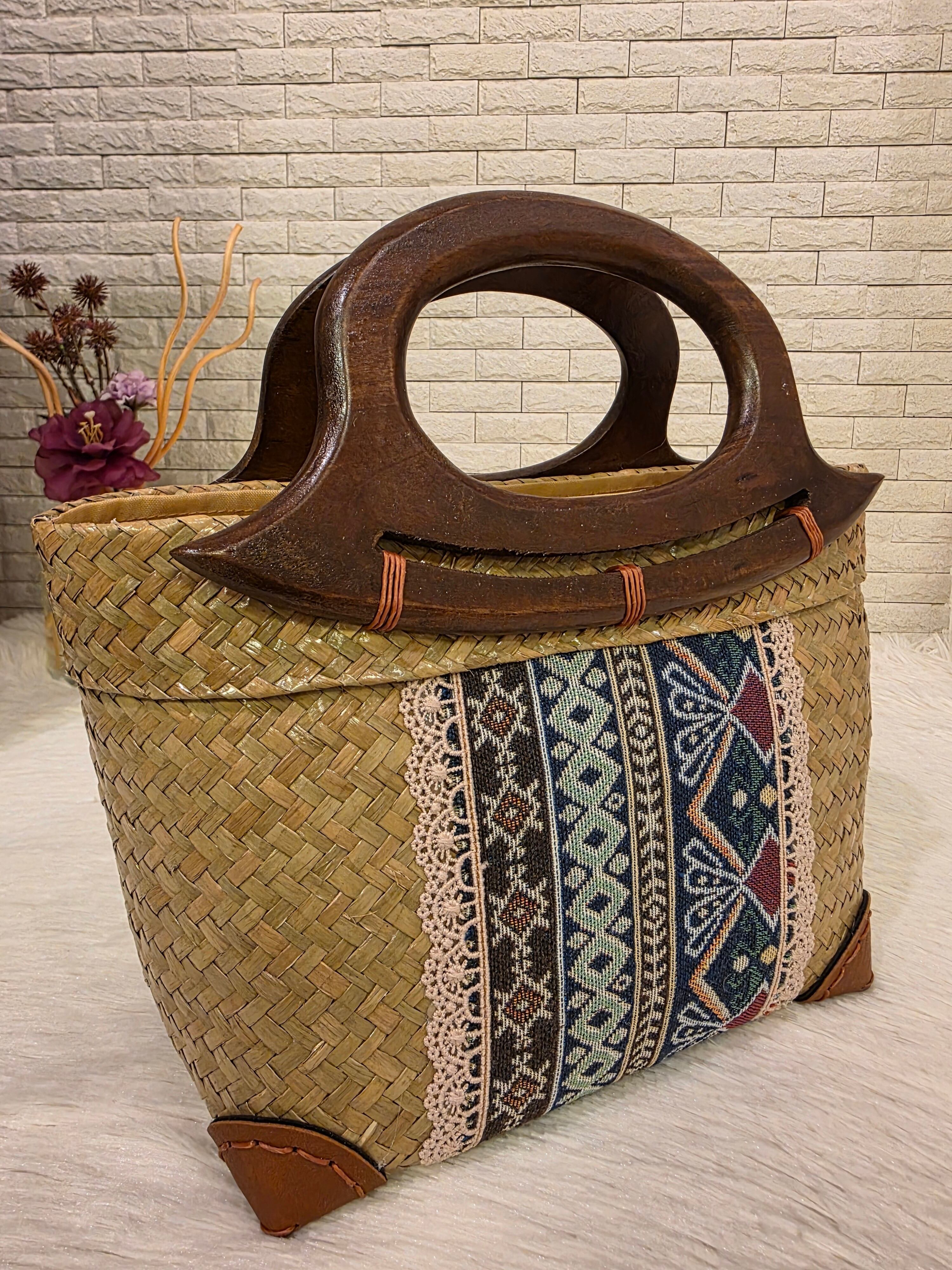 レトロなテキスタイルと木製ハンドルが可愛い♪ カゴバッグ