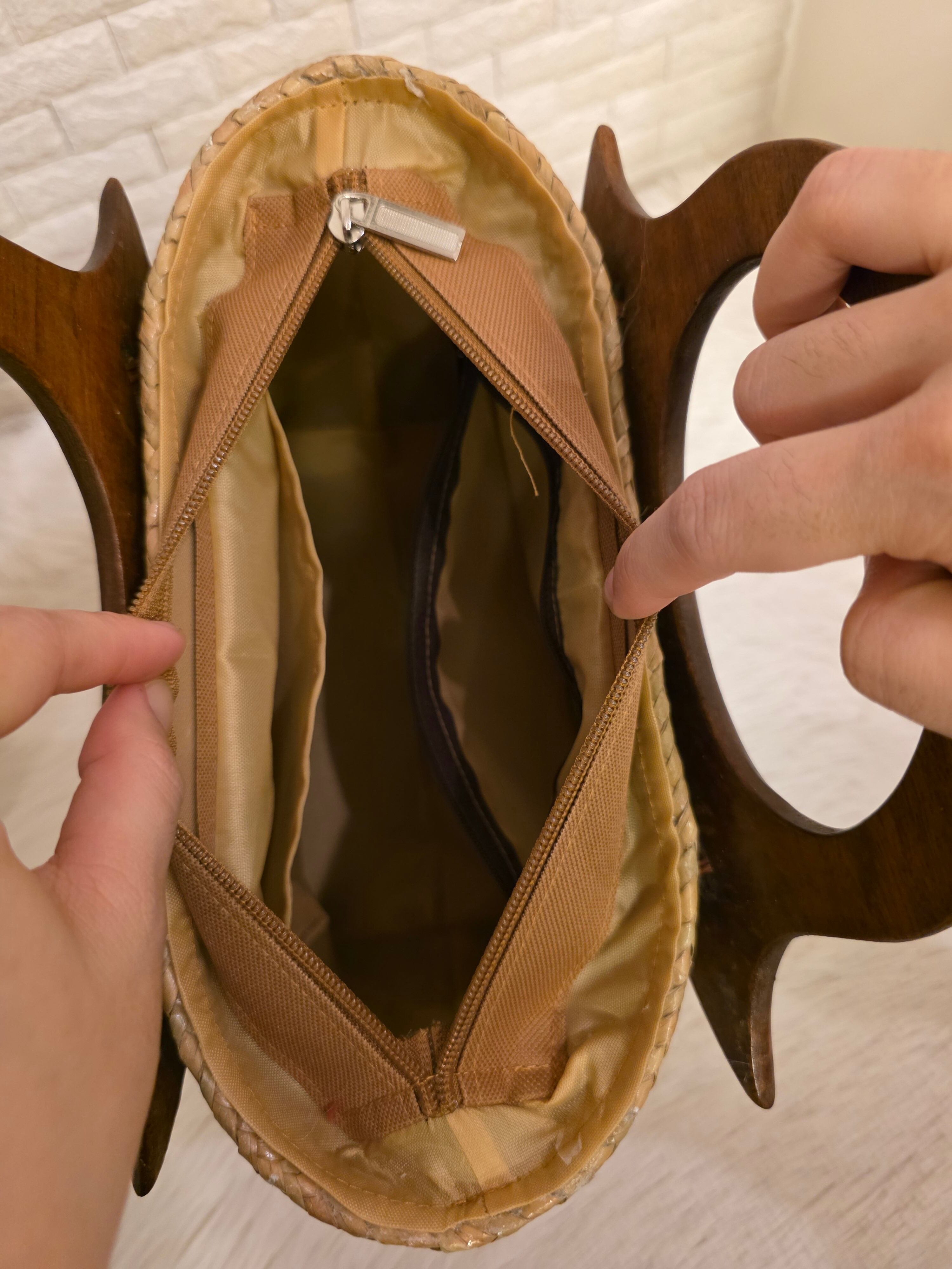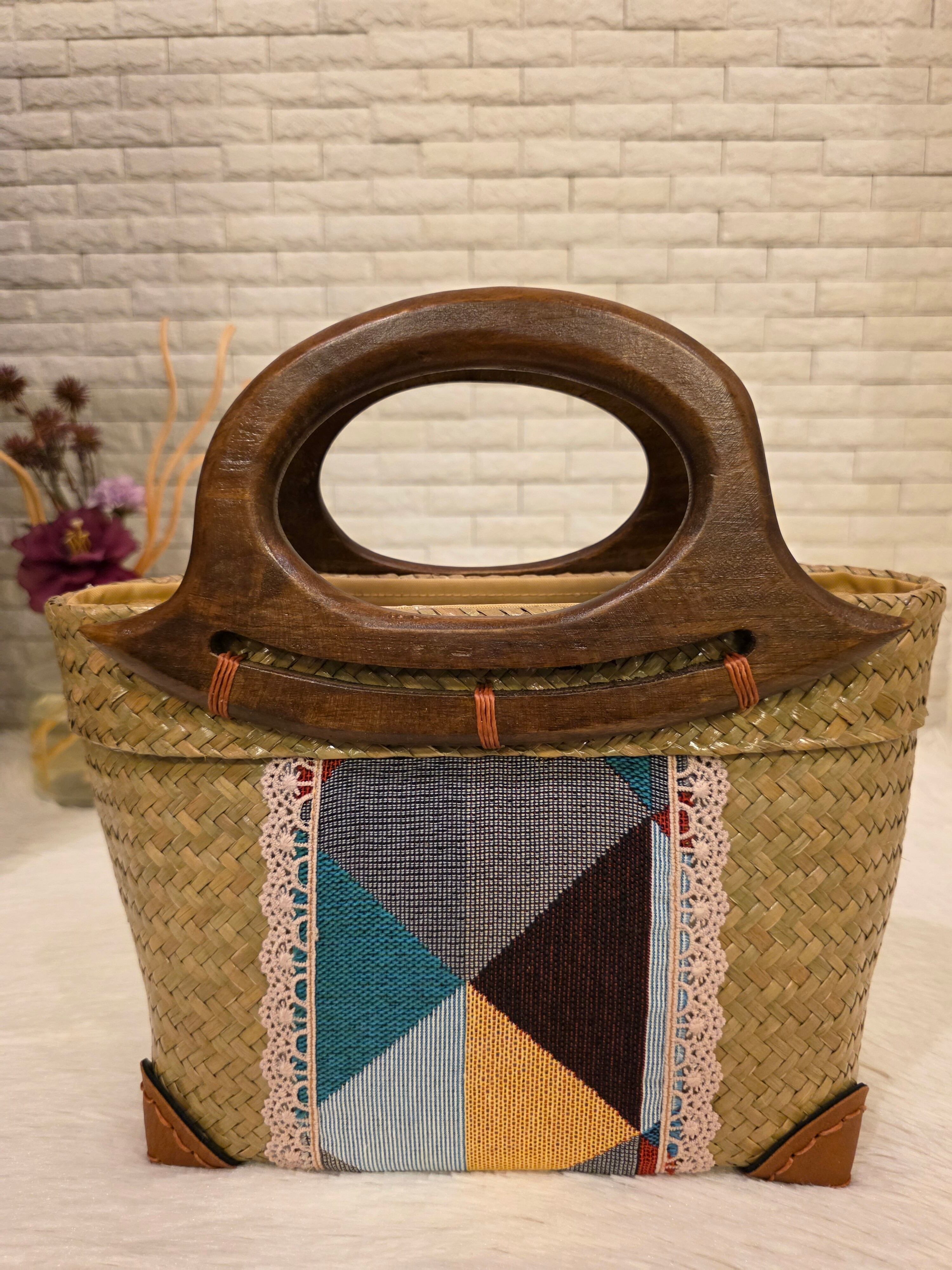本体は、職人の手によって丁寧に編み上げられた天然素材。その上部に配された色とりどりの柄が、バッグ全体に華やかさをプラスしています。