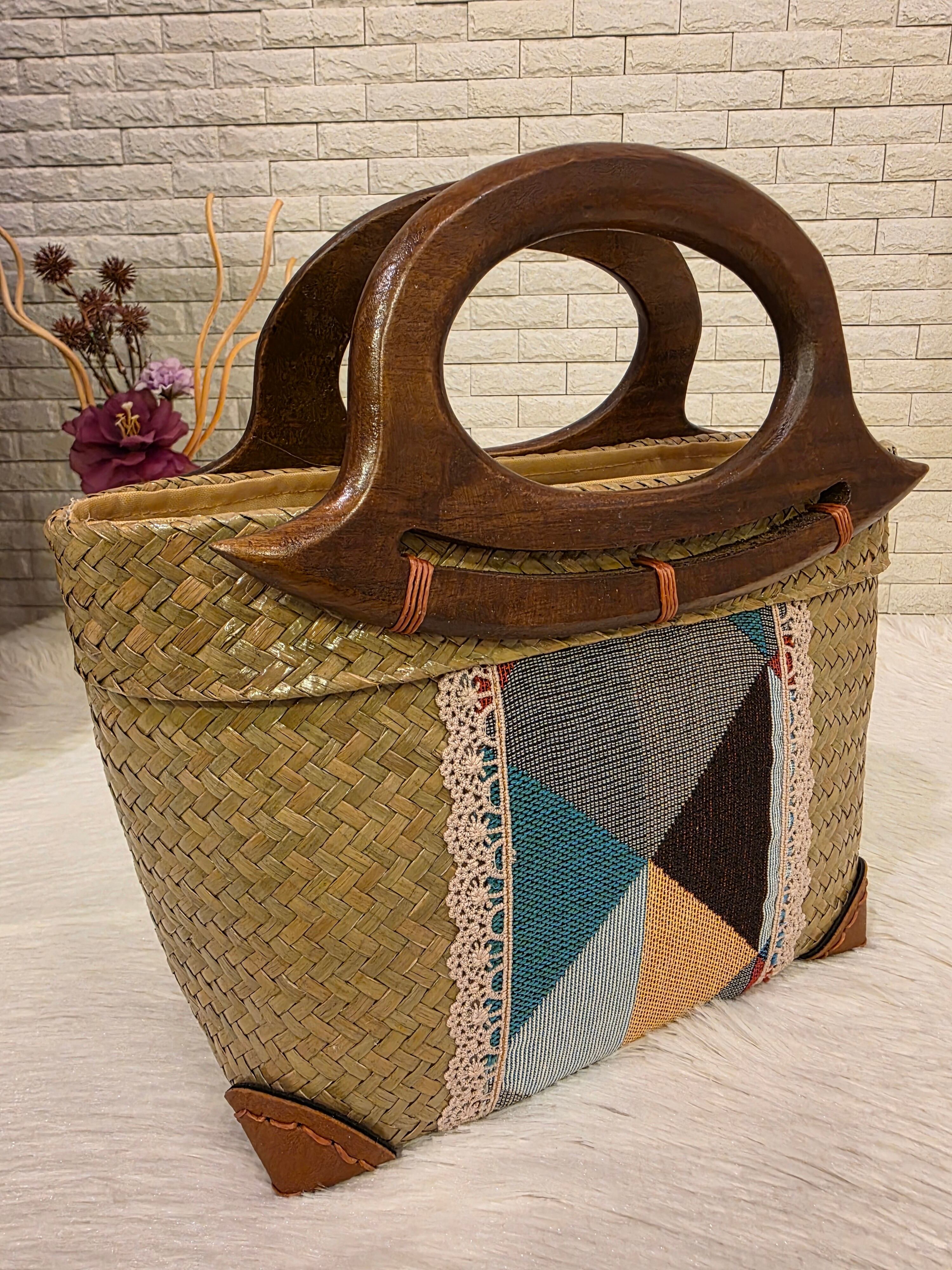 レトロなテキスタイルと木製ハンドルが可愛い♪ カゴバッグ
