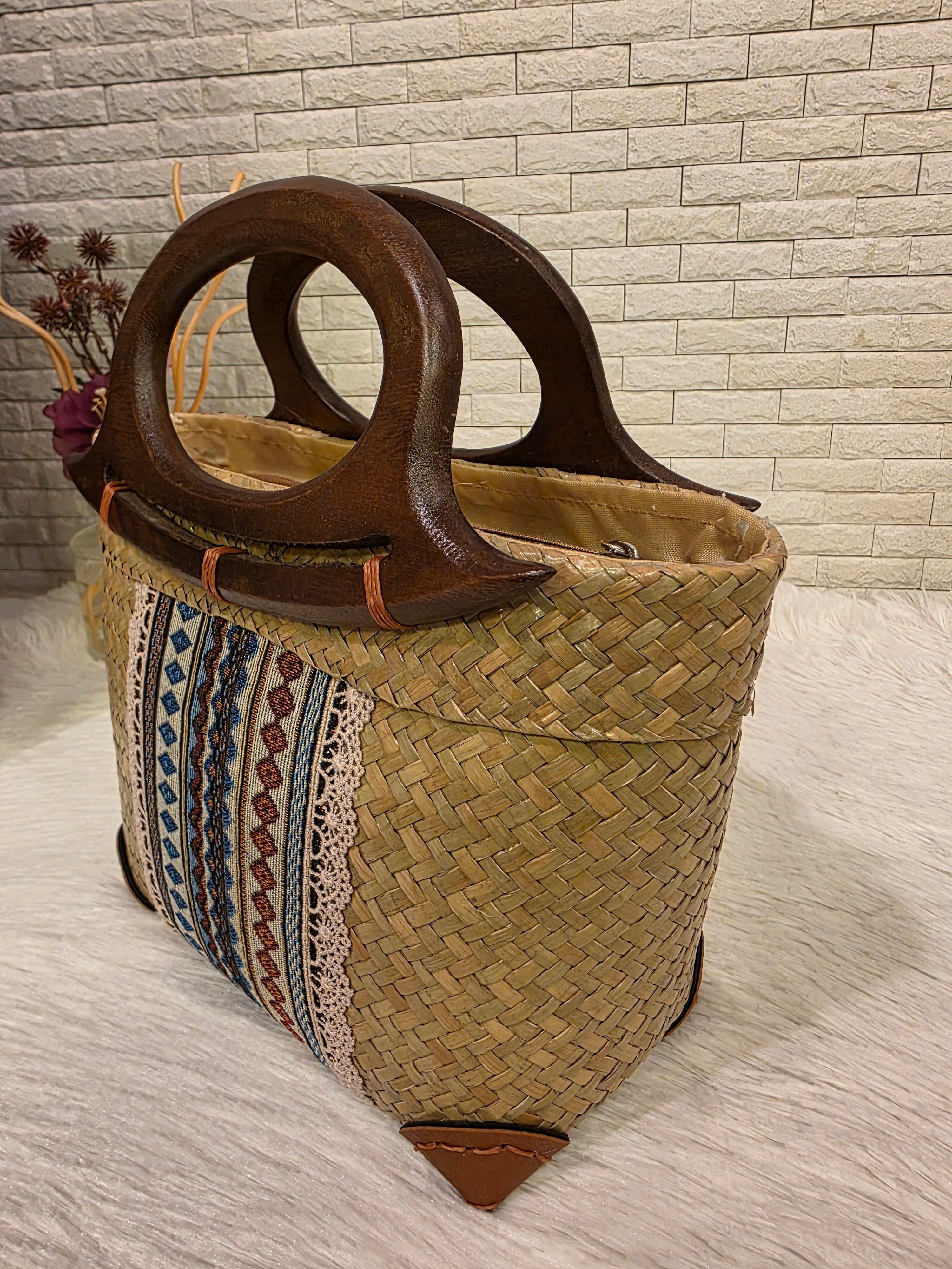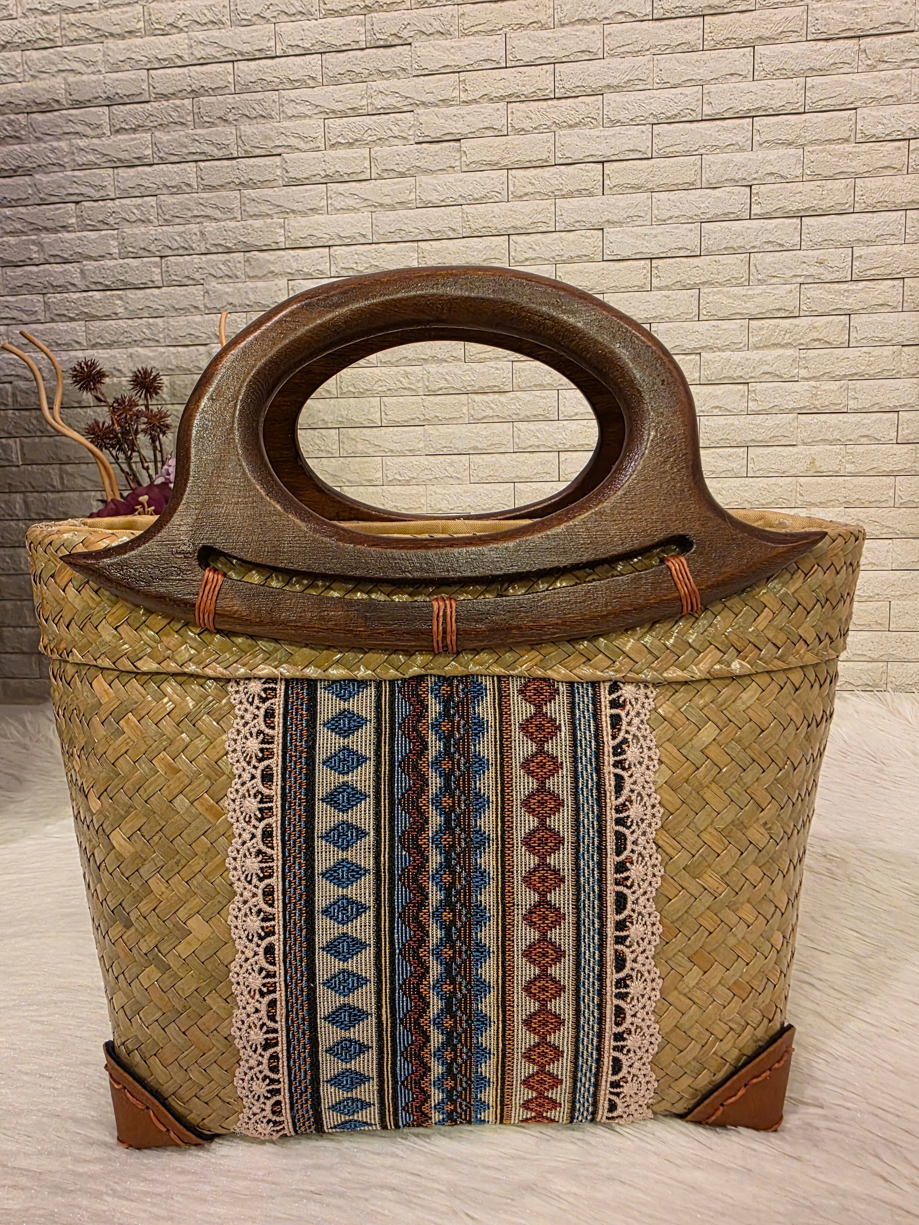 レトロなテキスタイルと木製ハンドルが可愛い♪ カゴバッグ