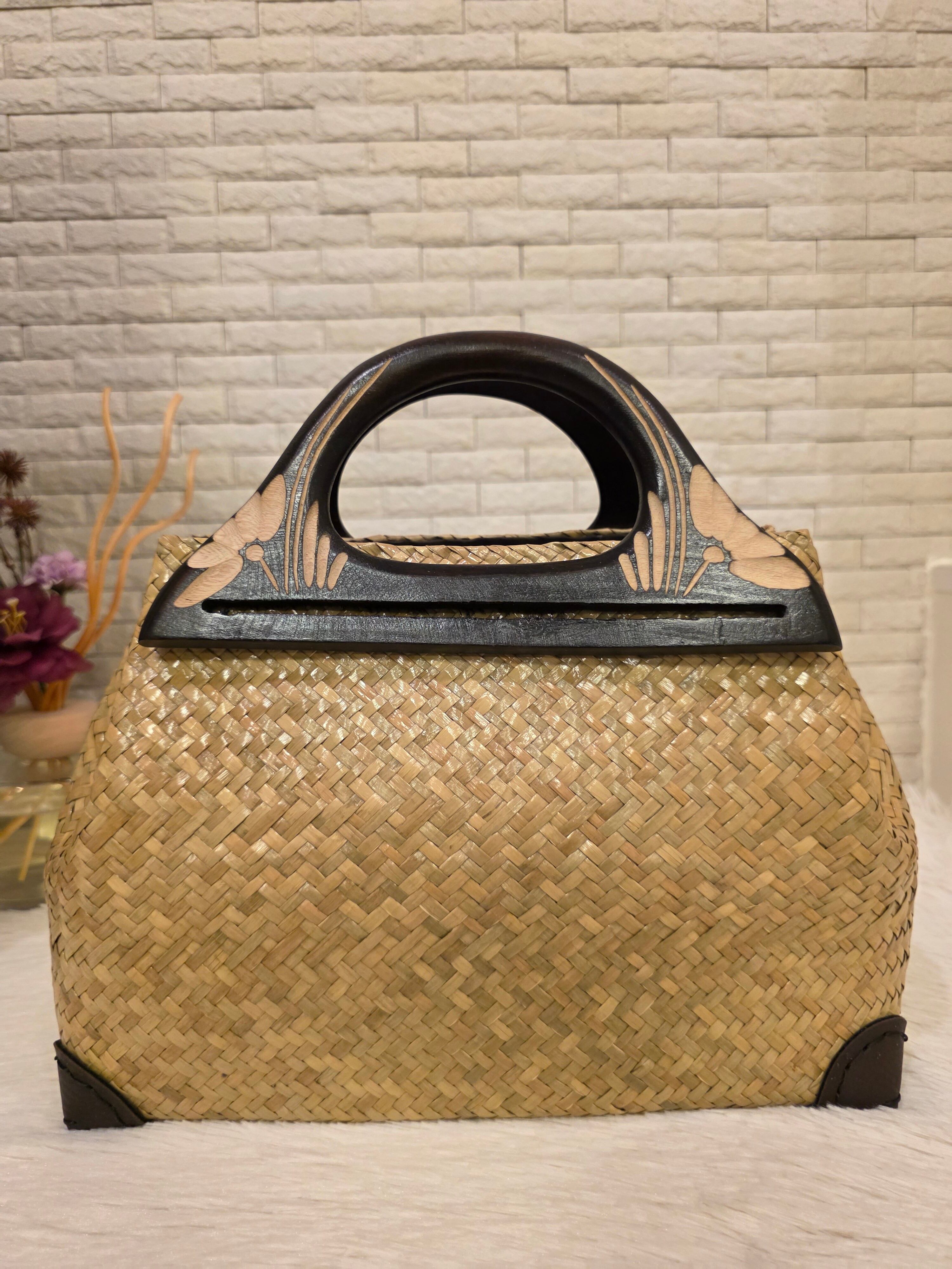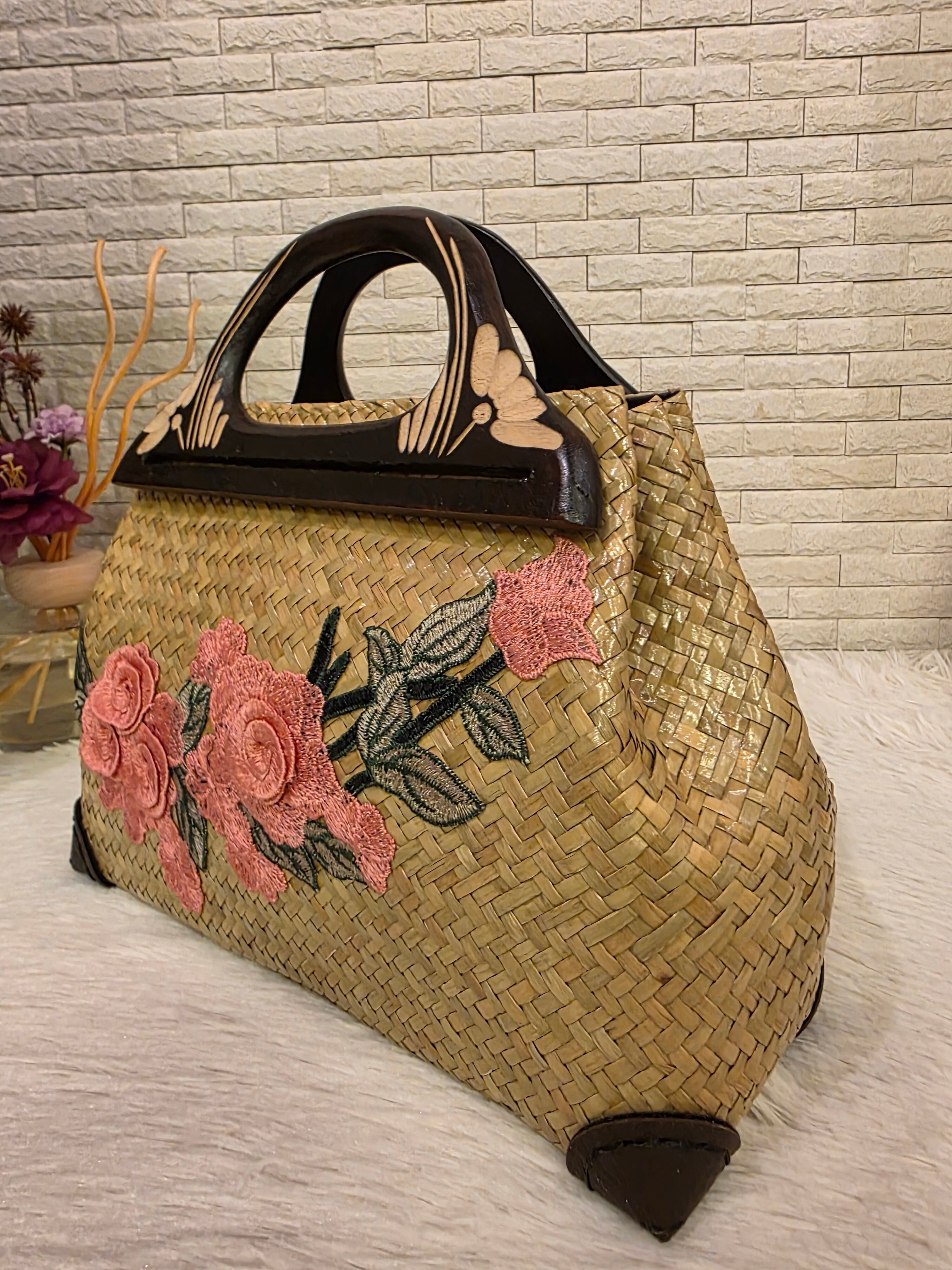 本体は、職人の手によって丁寧に編み上げられた天然素材。そのナチュラルな風合いに、鮮やかなピンクの花の刺繍が映え、ぱっと目を引くデザインです。