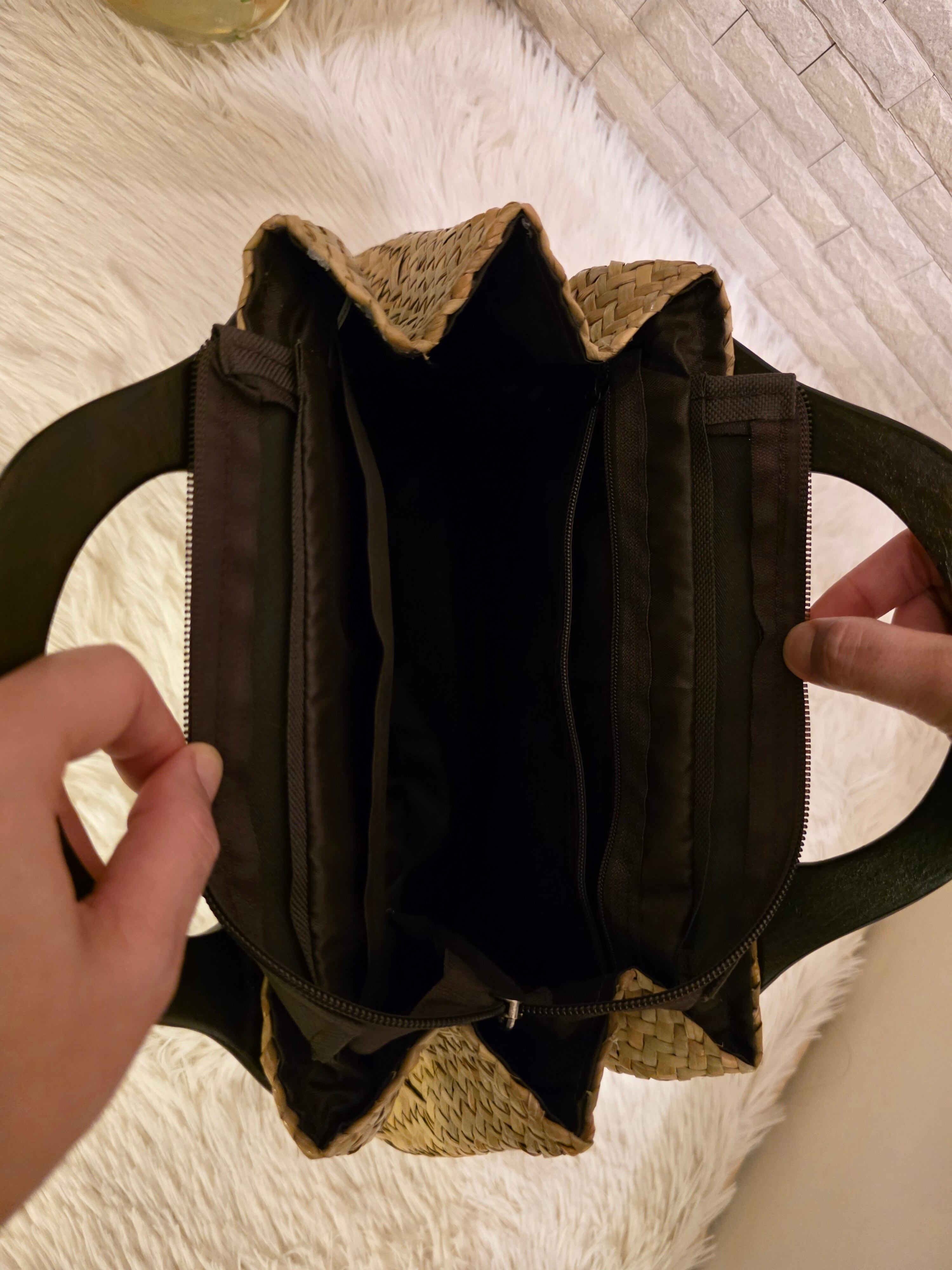 バッグの口は安心のファスナー開閉式で、中身が見える心配がありません。内側には中央に仕切り兼用のファスナーポケットがあり、さらに複数のオープンポケットも付いているので、荷物をきれいに整理して収納できるのが嬉しいポイントです。