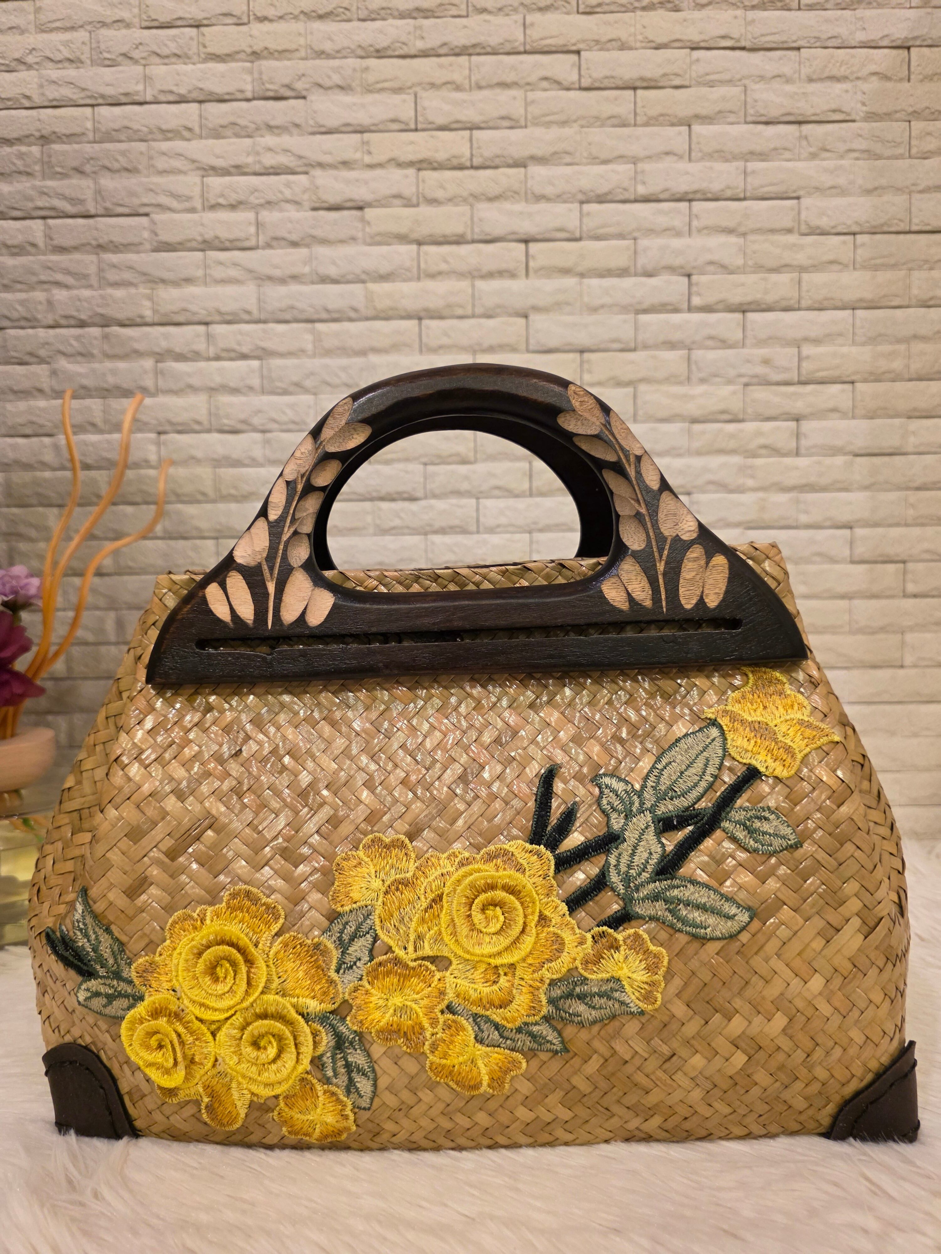 本体は、職人の手によって丁寧に編み上げられた天然素材。そのナチュラルな風合いに、鮮やかな黄色の花の刺繍が映え、ぱっと目を引くデザインです。