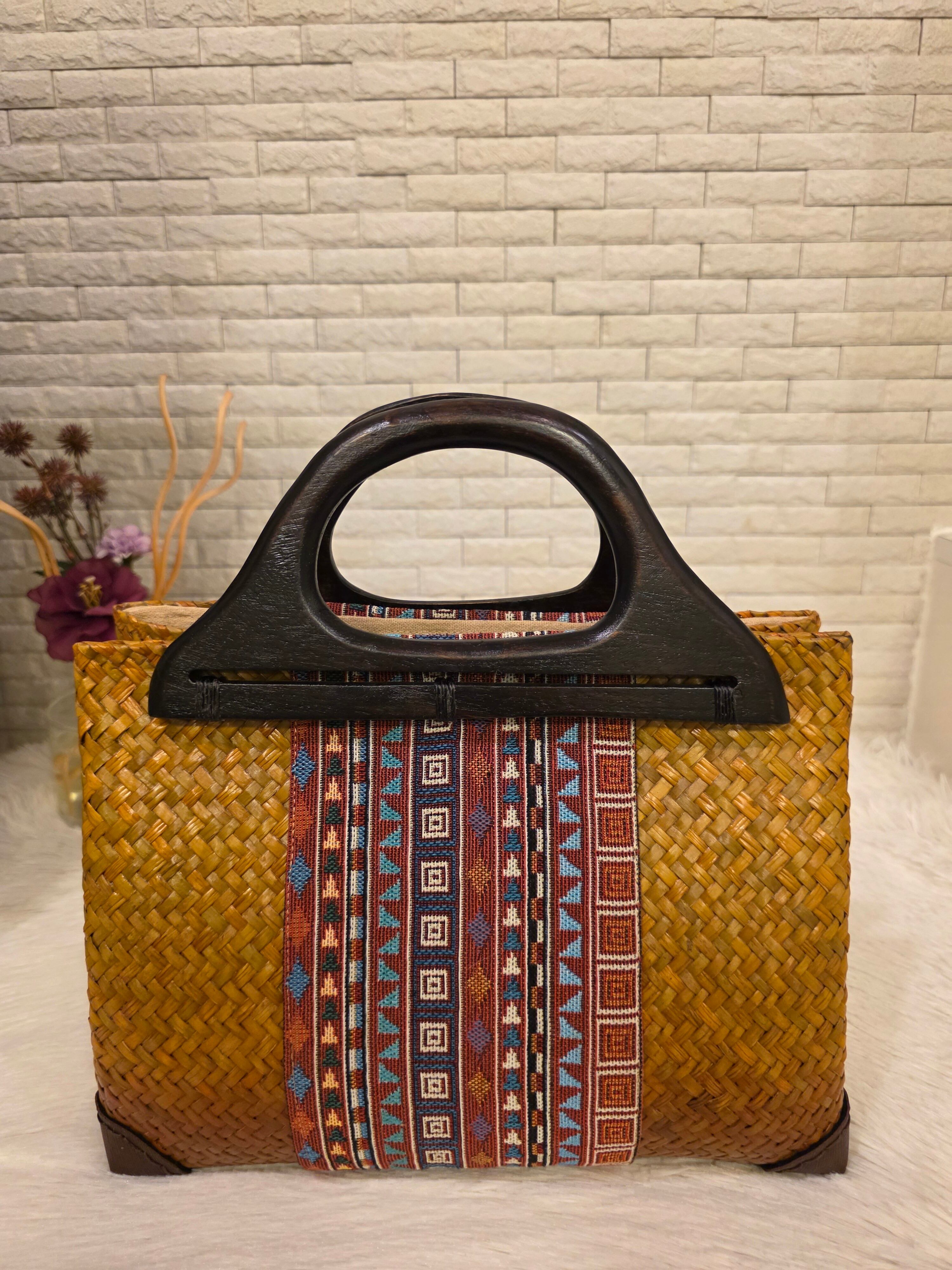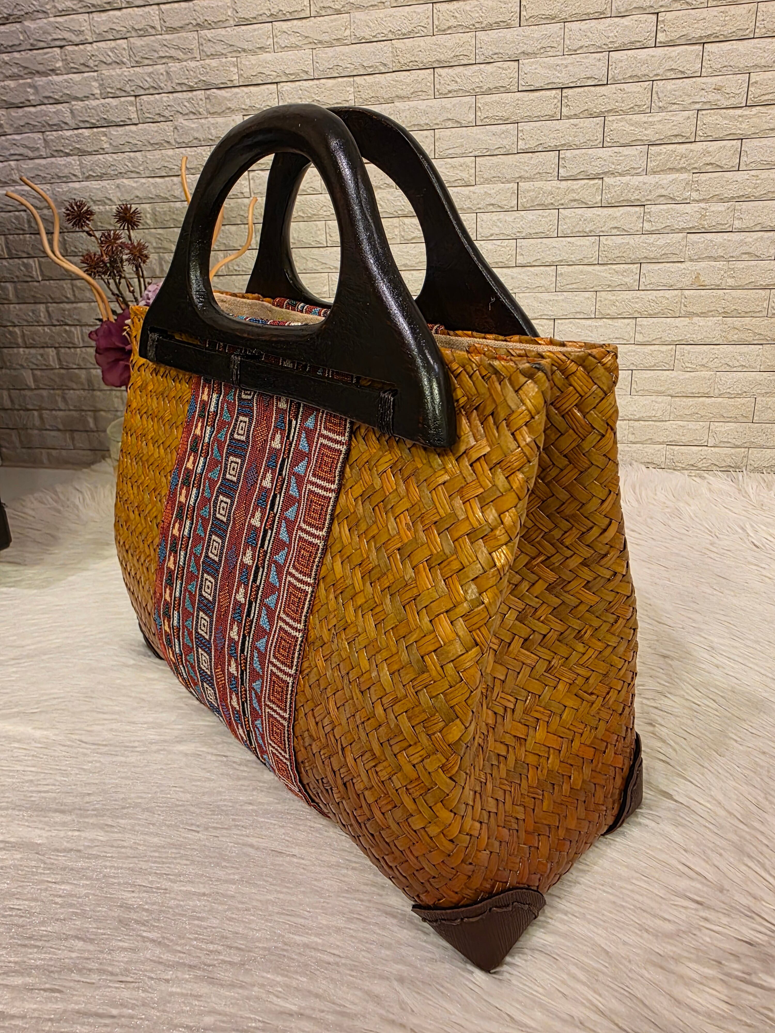 本体は、職人の手によって丁寧に編み上げられた天然素材を使用しています。持ち手には、滑らかな手触りと、美しい曲線を描く木製ハンドルが使われており、可愛らしさと上品さを兼ね備えています。