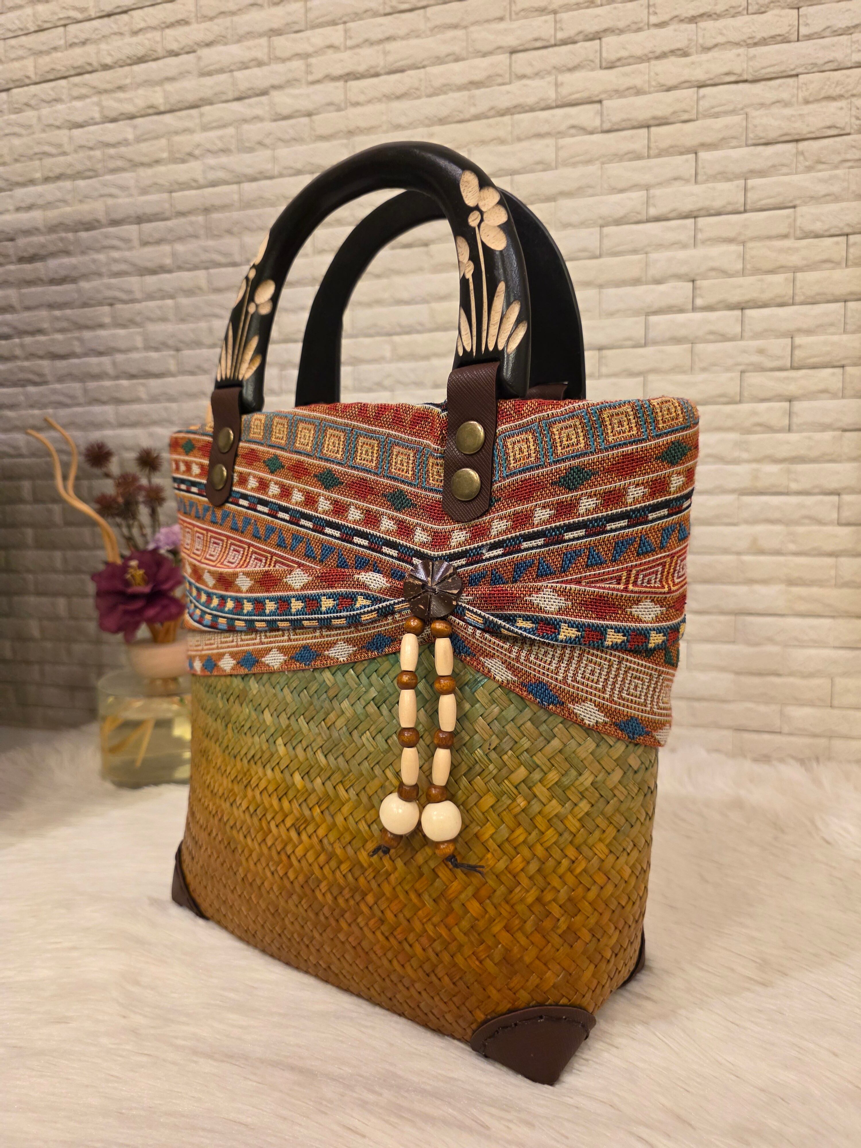 幾何学模様や花柄、菱形など、様々なカラフルなテキスタイルが目を引く、個性あふれるカゴバッグです。