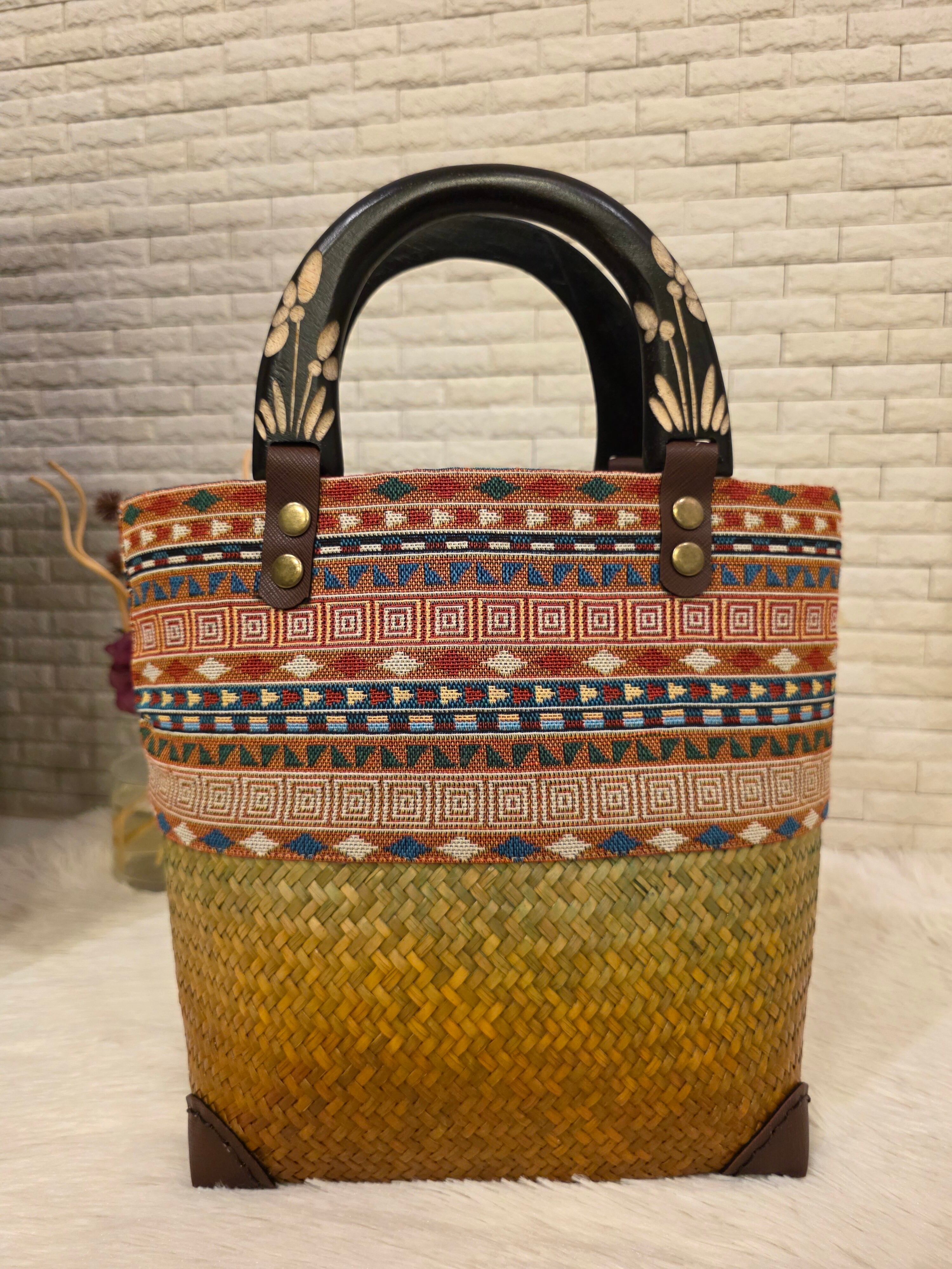 レトロなテキスタイルと木製ハンドルが可愛い♪ カゴバッグ