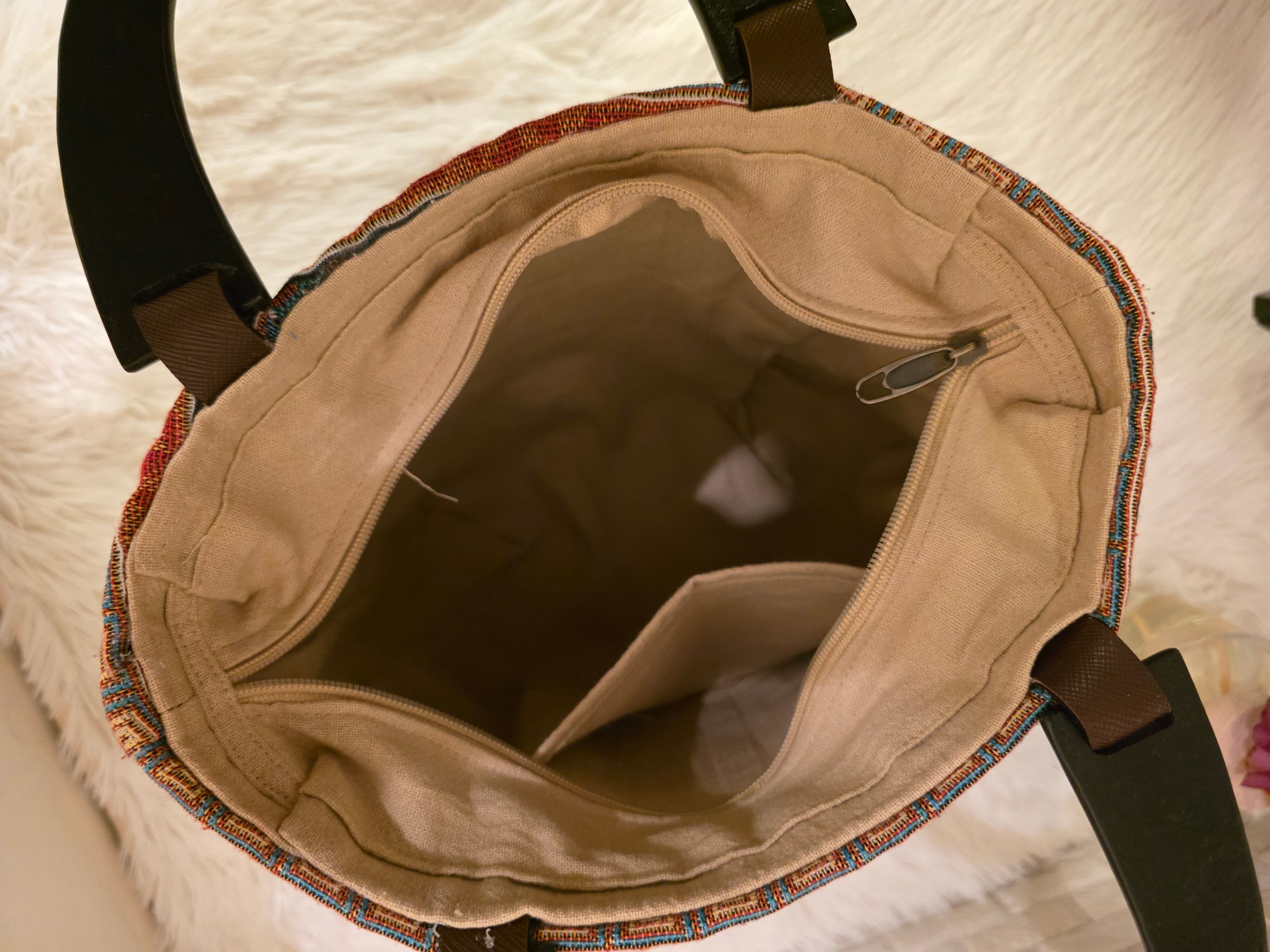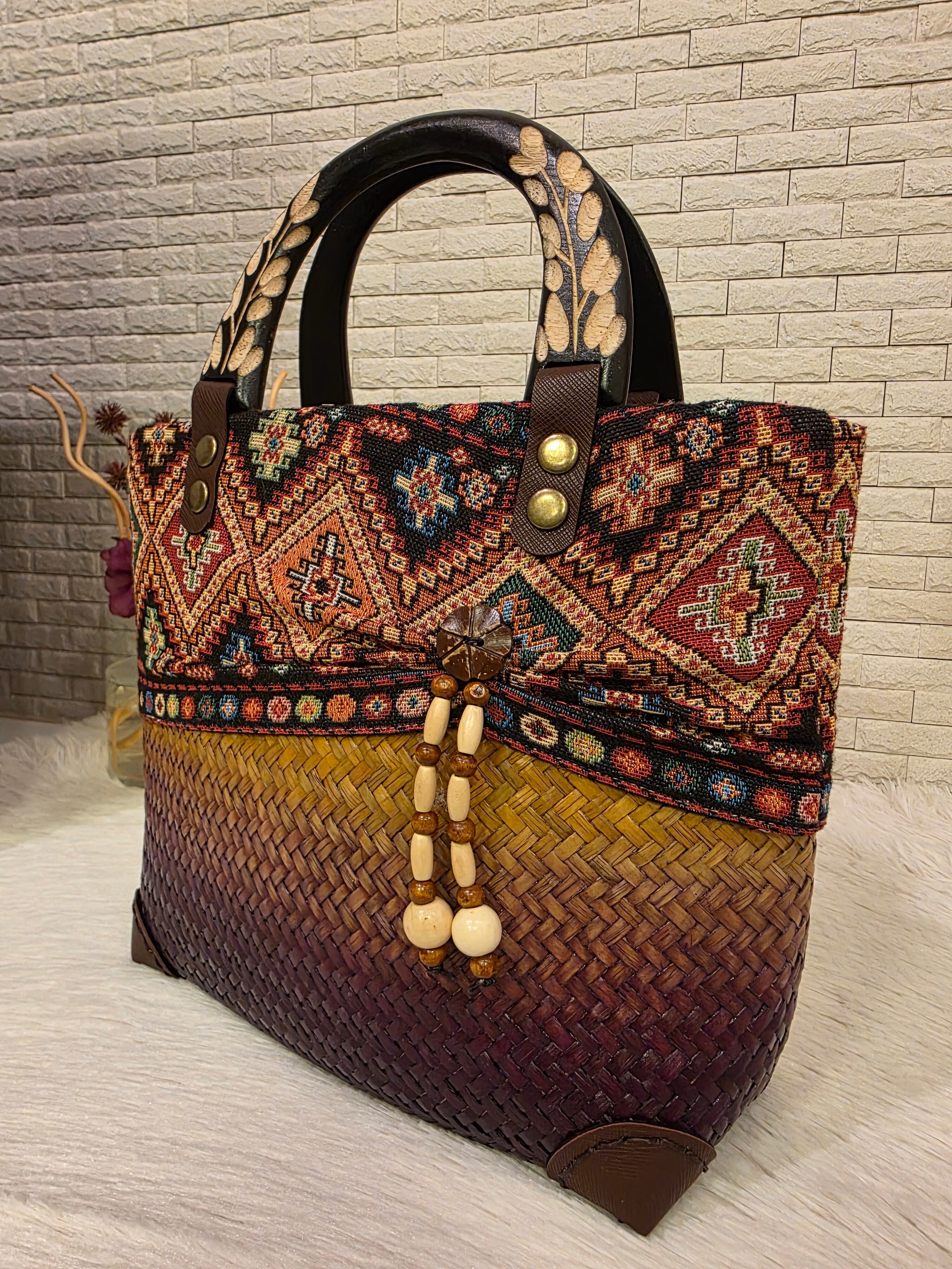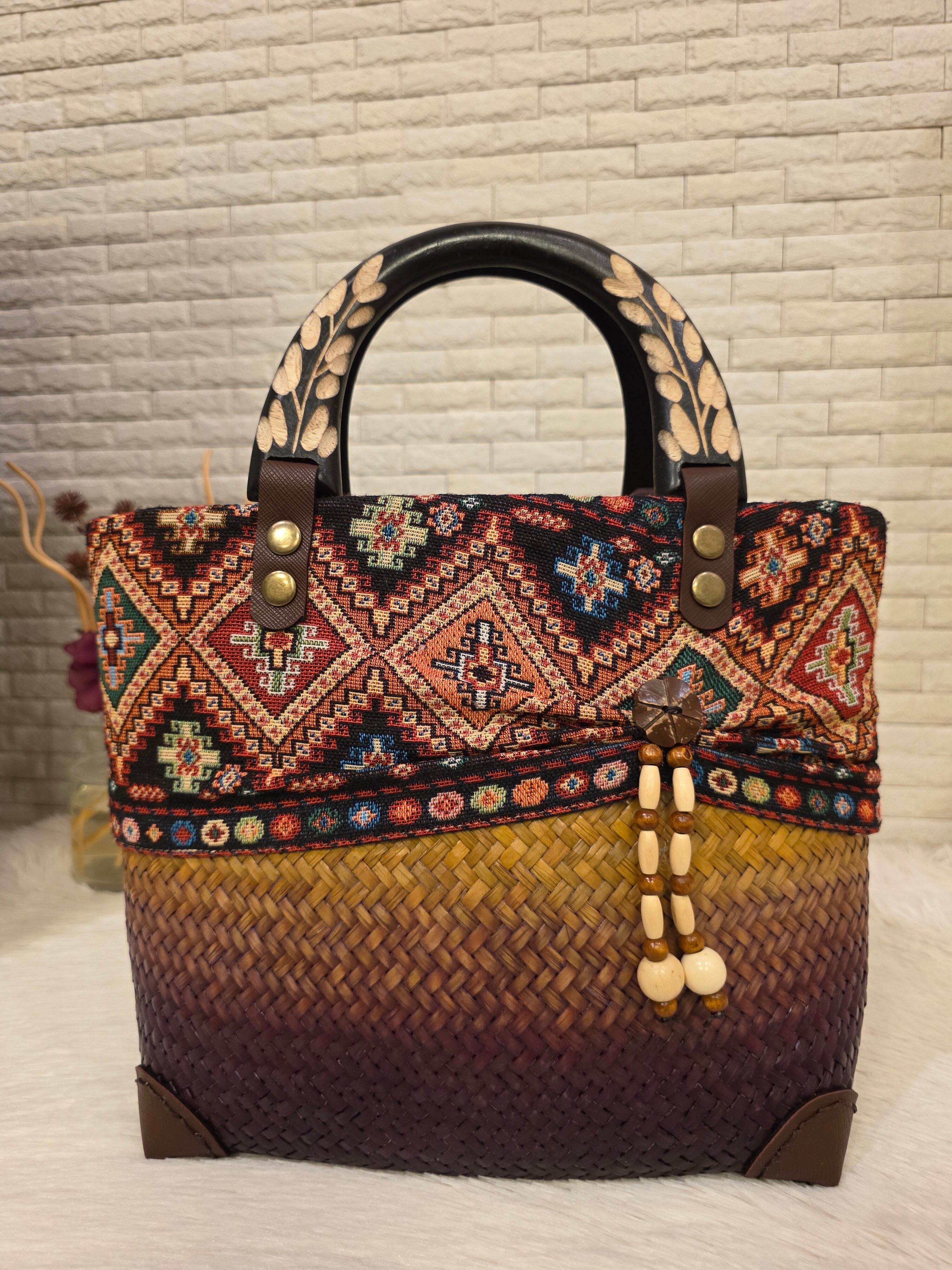 伝統的な織物を思わせる、レトロな柄が目を引くカゴバッグです。