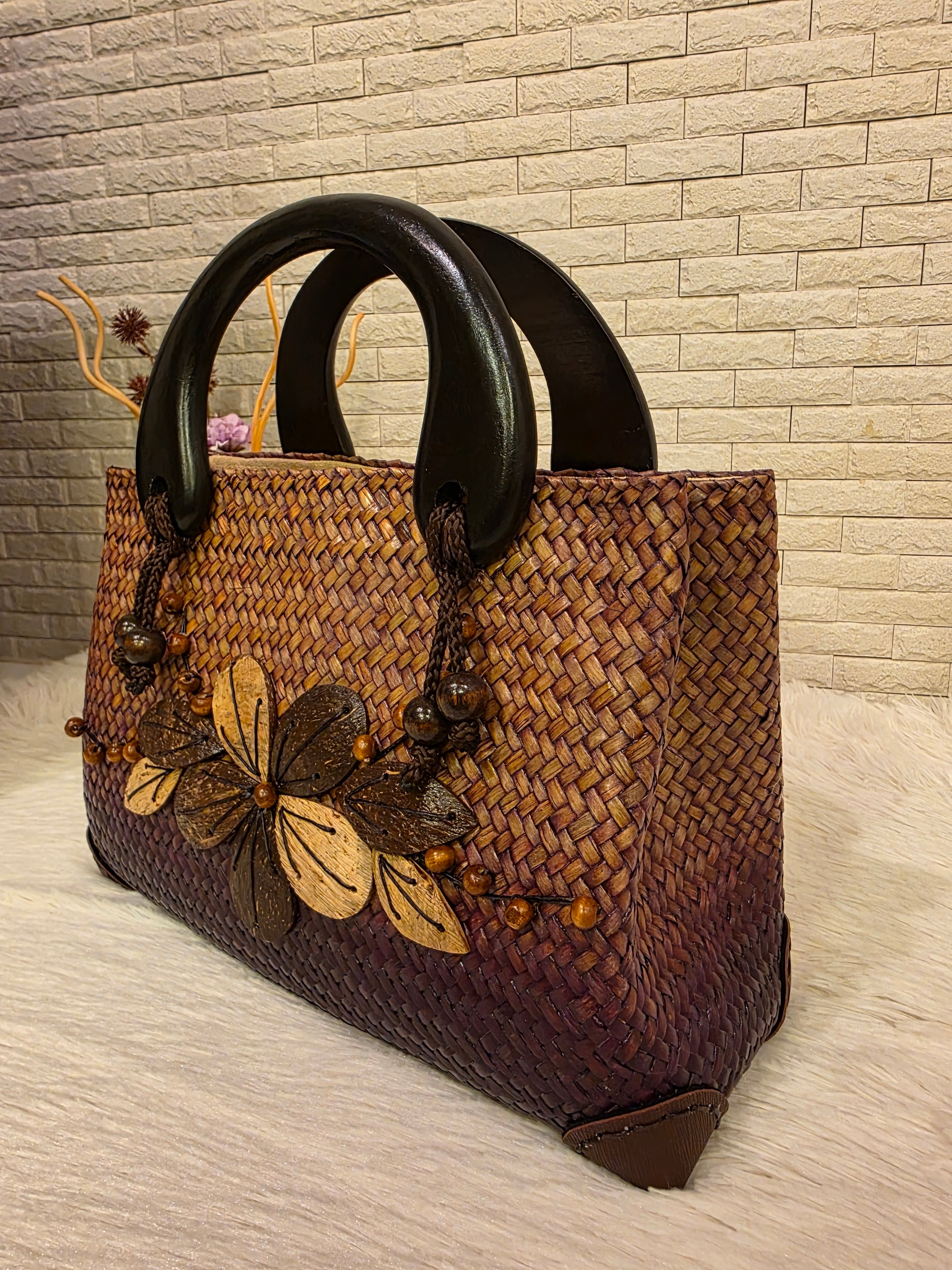 バッグのアクセントになっているのは、ココナッツを加工したユニークな装飾。自然素材ならではの優しい風合いが、他にはない個性を生み出しています。