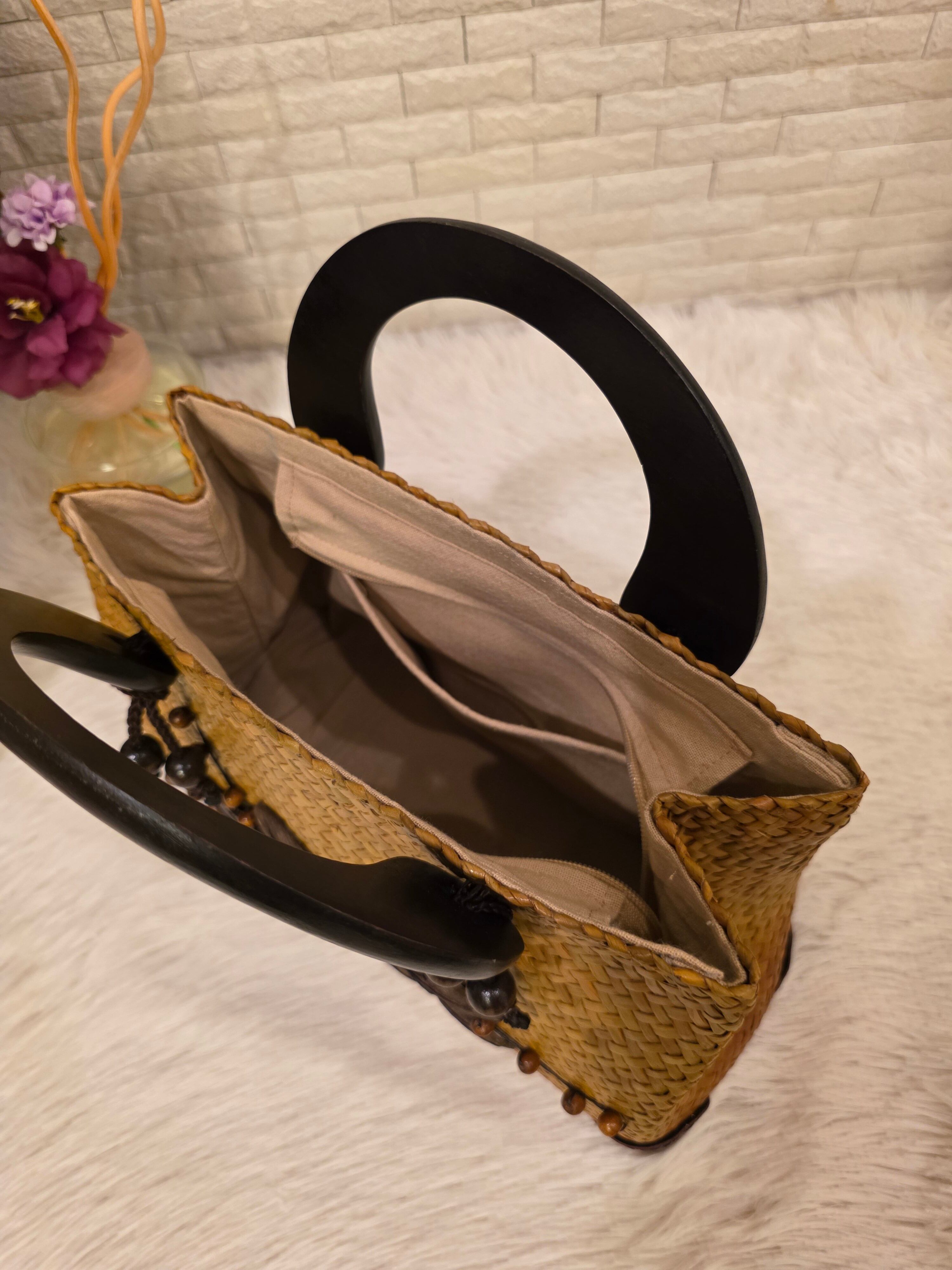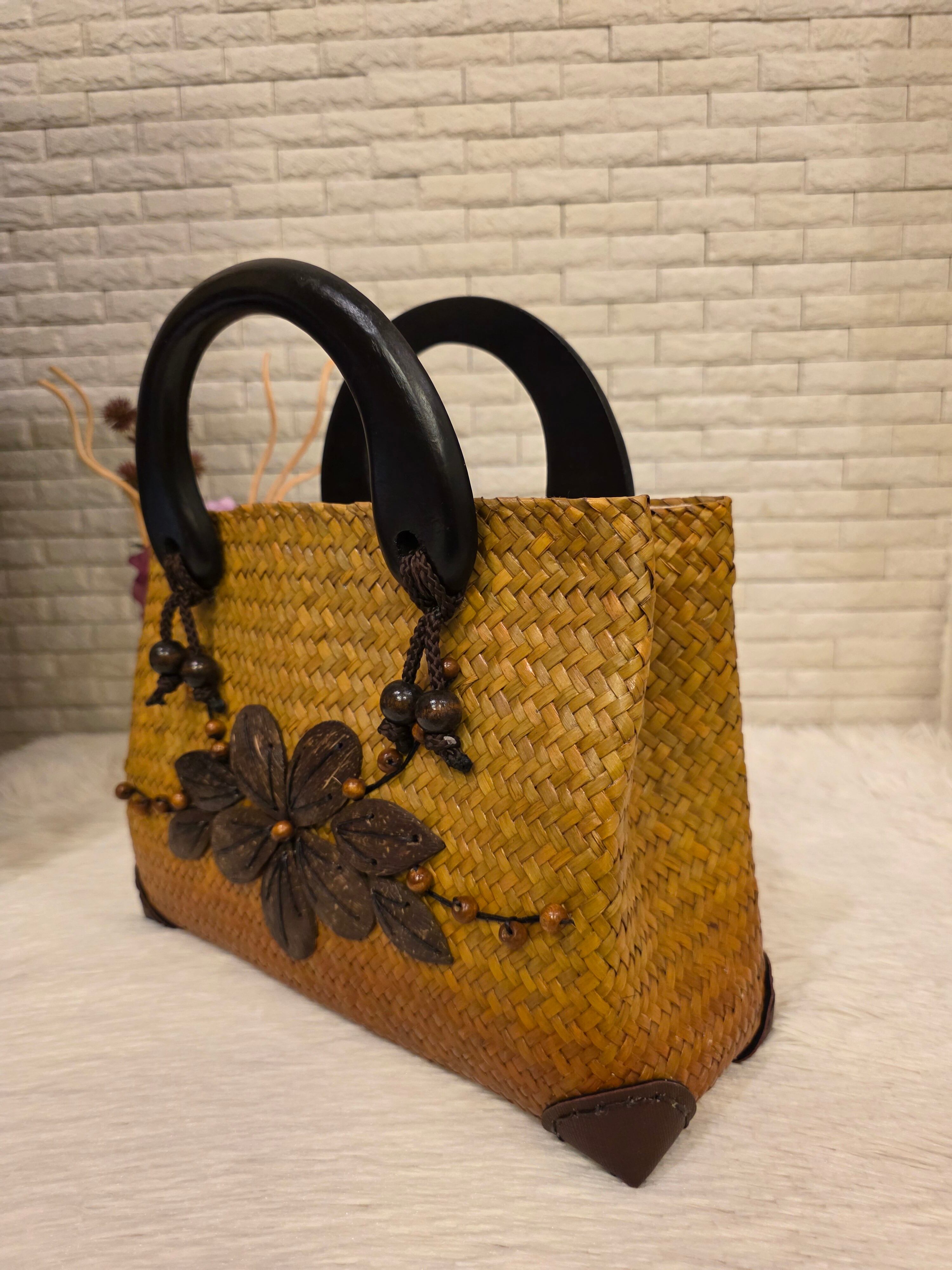 バッグのアクセントになっているのは、ココナッツを加工したユニークな装飾。自然素材ならではの優しい風合いが、他にはない個性を生み出しています。